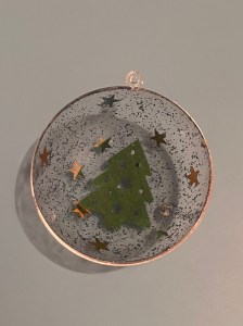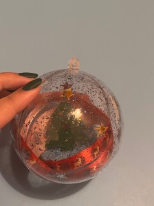 At this stage we can start filling our baubles, I did this by hanging a mini Christmas tree decoration to the inside with the help of invisible thread.