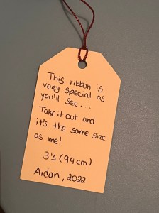 I used the gift tags to write a small poem such as ”This ribbon is very special as you will see…Take it out and it’s the same size as me!” and included the height, child’s name and year.