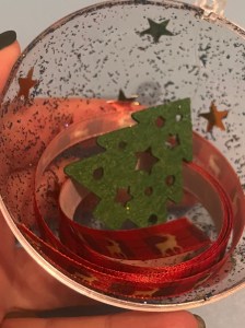 I measured every child’s height and cut the ribbon to match, I also place this inside the bauble and closed it. I applied the smallest amount of tape to the bottom of the bauble to keep it secure.
